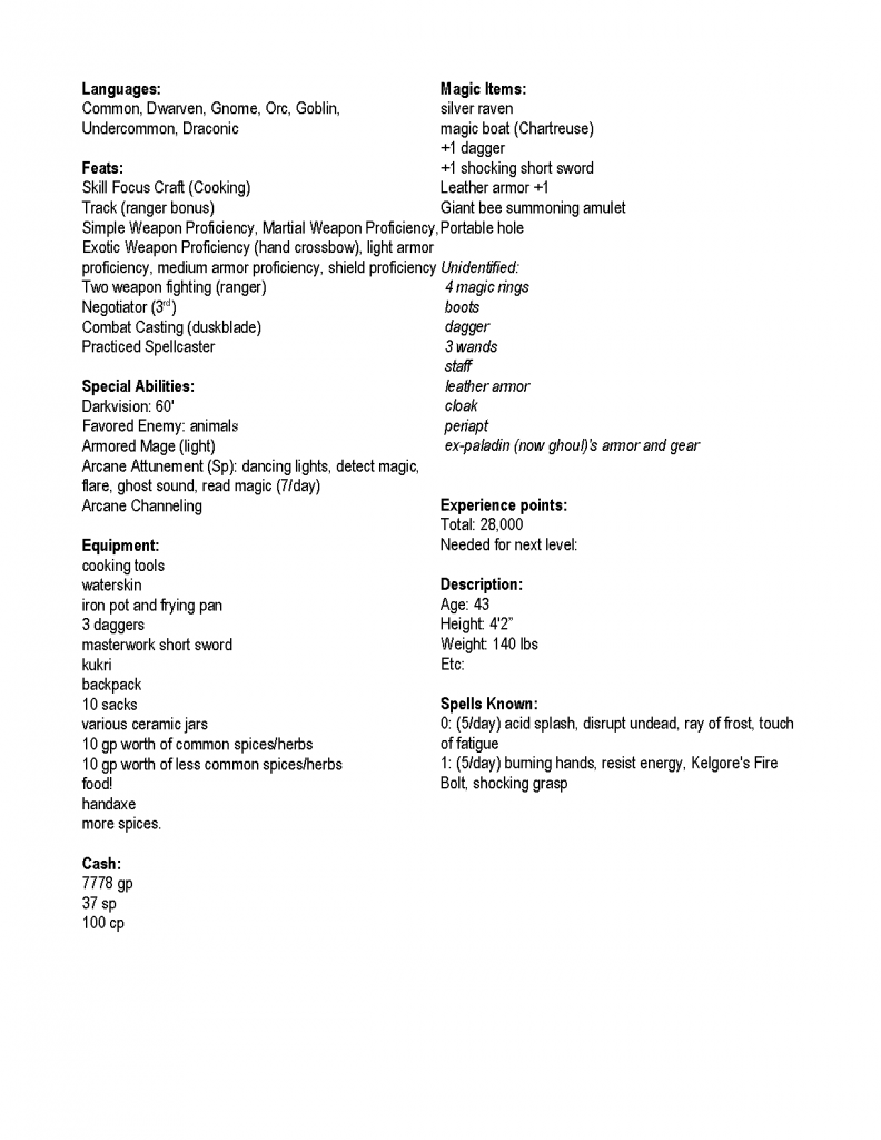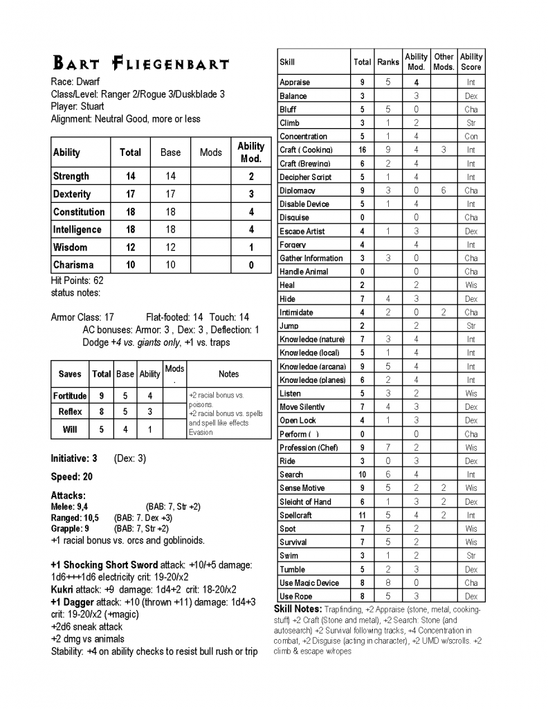 I thought I’d throw up a copy of his character sheet for your voyeuristic pleasure. He’s a pretty good example of the sort of character who grew very organically. He started out multiclassing ranger and rogue, but our group was hurting from the lack of arcane casting… and we’d just captured the spellbook of a drow wizard, so I used that as an excuse to multiclass once again into duskblade. I’m enjoying the duskblade bit – in particular, the truly obscene number of cantrips I can cast adds some flexibility to the character. I really don’t know where I’ll go from here. I might take my next two levels in ranger, but we’ll see…